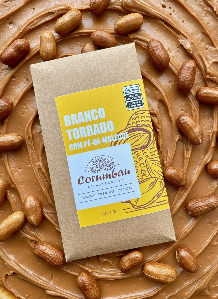 NOSSA BARRA DE CHOCOLATE BRANCO TORRADO COM PÉ DE MOLEQUE É UMA EXPLOSÃO DE SABOR E TEXTURA. O CHOCOLATE BRANCO PASSA POR UM PROCESSO DE TORRA ESPECIAL QUE REALÇA NOTAS CARAMELIZADAS E AMANTEIGADAS, TRAZENDO PROFUNDIDADE E UM SABOR ÚNICO. COMBINADO AO TRADICIONAL PÉ DE MOLEQUE- CROCANTE, DOCE NA MEDIDA E COM CHARME DO AMENDOIM – O RESULTADO É UM CHOCOLATE IRRESISTÍVEL, CHEIO DE PERSONALIDADE E BRASILIDADE.